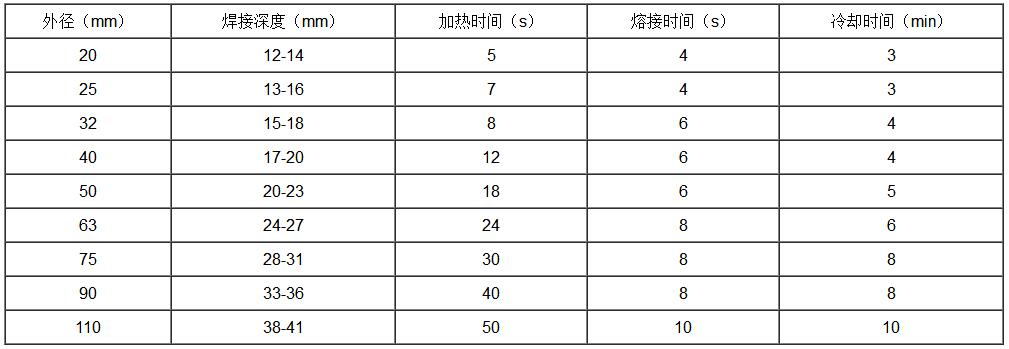 注:1、熱溶承接溫度260±10℃,本表適用的環(huán)境溫度為20℃,低于環(huán)境溫度時,加熱時間可適當(dāng)延長;